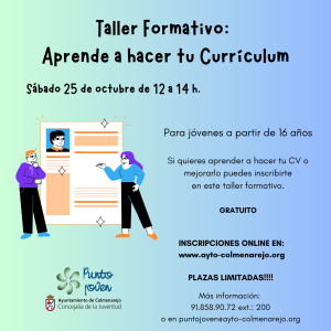 El Punto Joven ofrece a los jóvenes de Colmenarejo un taller formativo con el que poder aprender o mejorar su currículum. Será el sábado 25 de octubre de 12 a 14 h. en el Punto Joven. Las plazas son limitadas y necesitas inscribirte previamente AQUÍ